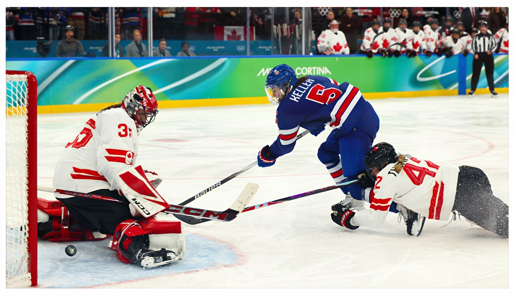 Yesterday, the USA women were challenged by the Canadian women. Canada had a 1 – 0 lead with only 2 minutes left in the final period when USA tied it up to go into overtime.